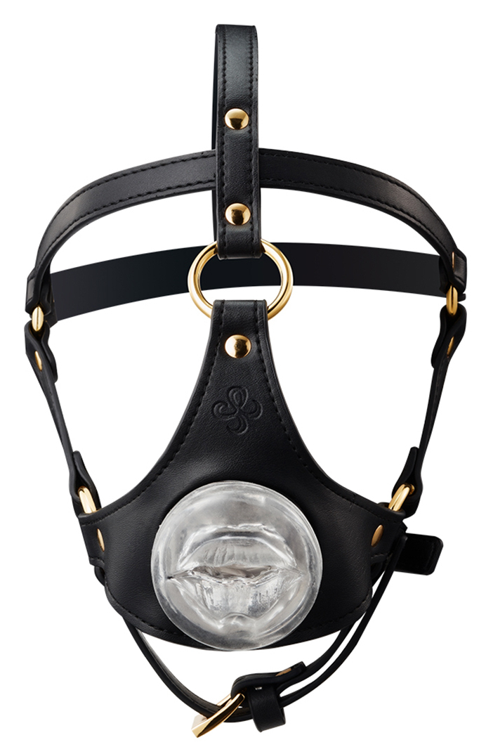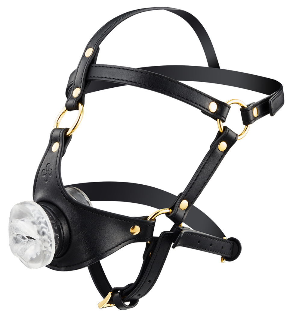 Bâillon avec une ouverture au niveau de la bouche de 40 mm de diamètre.  Masturbateur transparent entrée bouche, d’un diamètre intérieur de 30 mm. Ajustables de 43 à 53 cm pour la nuque et de 54 à 64 cm pour l’arrière de la tête.  Masturbateur silicone, attaches en zinc, le reste en simili.
