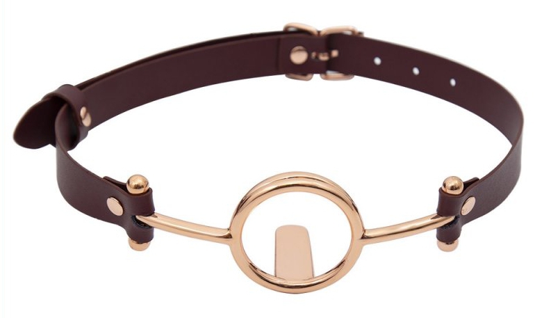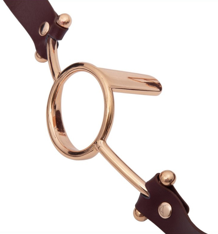 Ce bâillon O Tongue est un accessoire Sm conçu avec des sangles bordeaux et des éléments en métal couleur Bronze-rosé.Il a une ouverture ronde de 40mm de diamètre avec une partie plate qui entre dans la bouche et maintient la langue à plat (3.5cm de longueur).Sangle ajustable en simili. Tour de cou de 48 à 68cm.