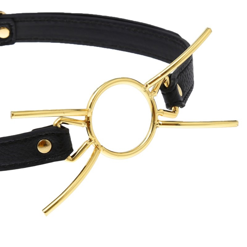 Bâillon noir et doré avec un anneau central de 38 mm.Les branches font 5 cm de longueur. Tour de tête de 47 à 65 cm. En simili