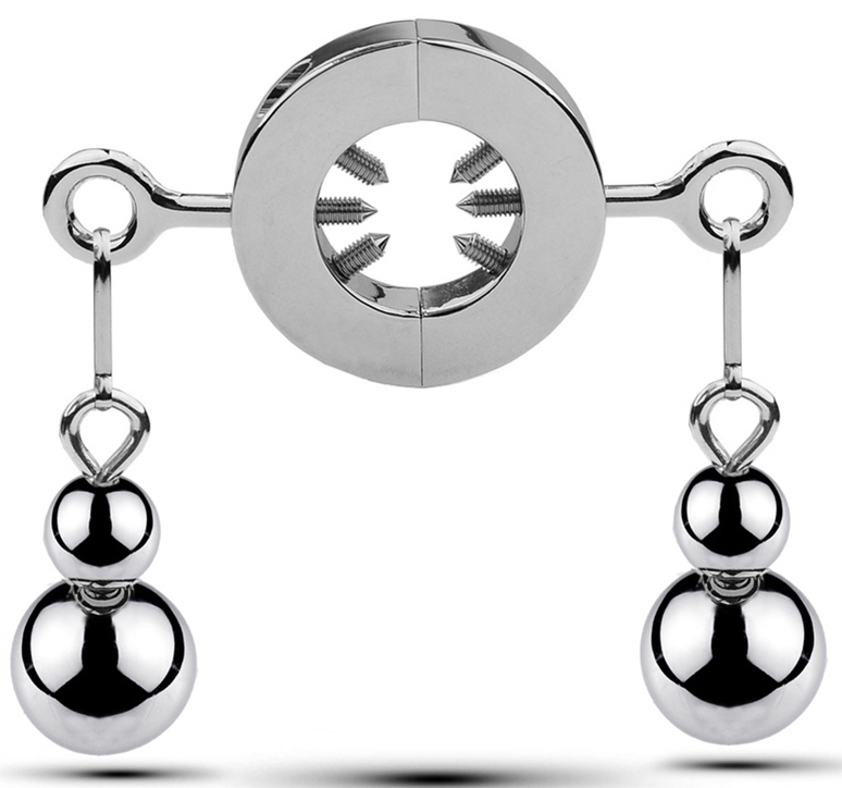 Surpassez-vous avec ce ballstretcher avec pics et poids lors de vos jeux SM les plus hard. Pour des sensations extrêmes ! Il comprend : un diamètre insérable de 33mm sans pics et 12mm avec pics 6 pics d’environ 1cm de long 2 poids ajustables chacun : 102g (2 boules) ou 36g (1 boule) un poids total de 538g Entièrement démontable : avec ou sans poids, avec ou sans pics.