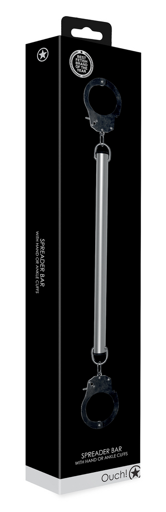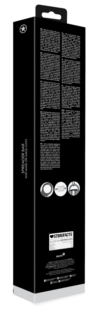 La Barre avec Menottes Spreader Cuffs vous permettra de prendre le contrôle de votre jeu BDSM. Vous pourrez l’utiliser pour entraver les mains ou les pieds de votre soumis. La barre mesure 35 cm et les menottes sont directement à portée de main. Le diamètre des menottes est de 55 à 65 mm. En métal