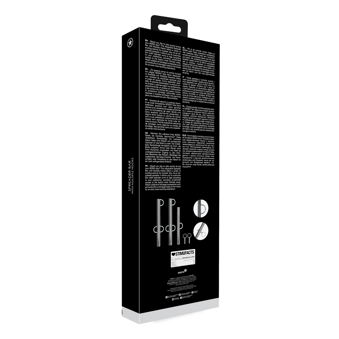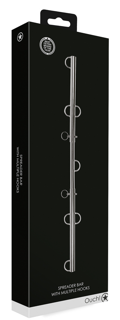 La Barre d’Attaches Spreaderhooks possède différents anneaux pour attacher différentes cordes ou menottes.  Elles se composent de 2 barres de 30 cm et d’une troisième de 25 cm, largeur 22 mm.Longueur totale de 76 cm. Il dispose de 2 double-anneaux et de 3 anneaux d’un seul côté.  En métal