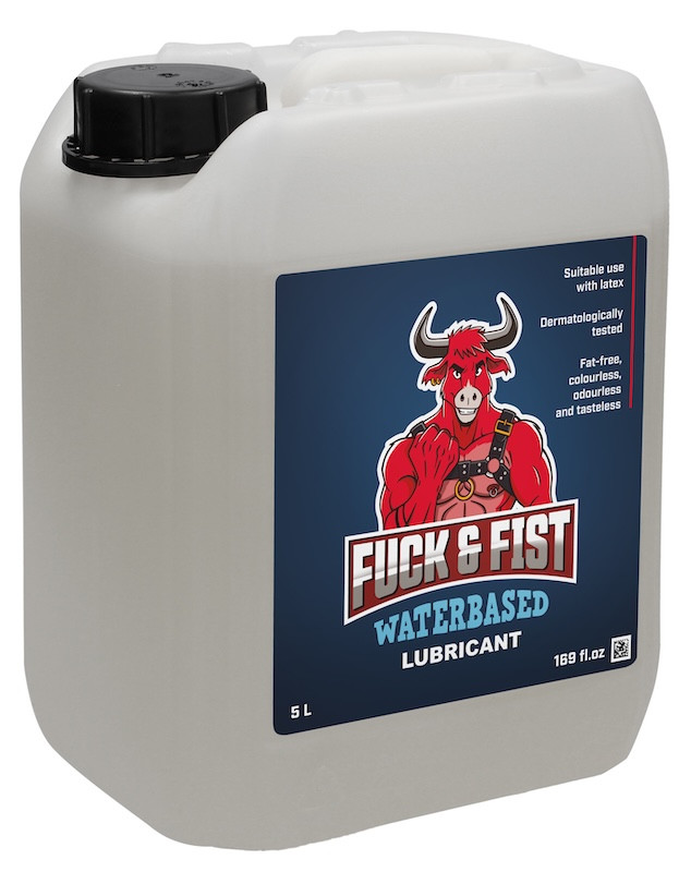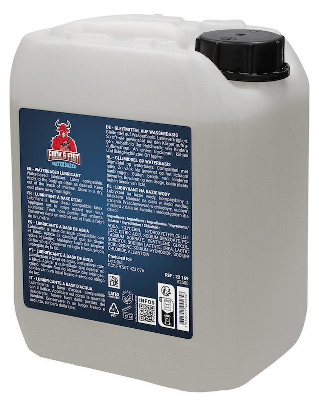 Format Bidon de 5 Litres pour le Lubrifiant Fuck & Fist Water, à base d’eau.Avec une texture fluide, non grasse et non collante.Compatible avec les préservatifs en latex.