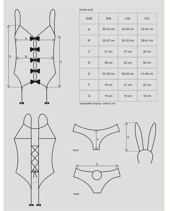 Composition:Guêpière, culotte et oreilles: 88% polyester, 12% élasthanneBas: 80% nylon, 20% élasthanne Guide des tailles: Taille Hanches Taille de buste S/M 60-75 cm 90-100 cm 80-90 cm L/XL 75-90 cm 100-110 cm 90-100 cm