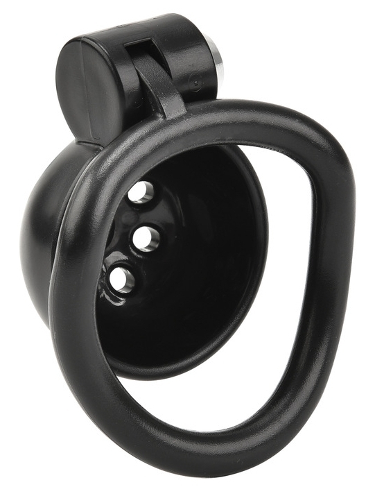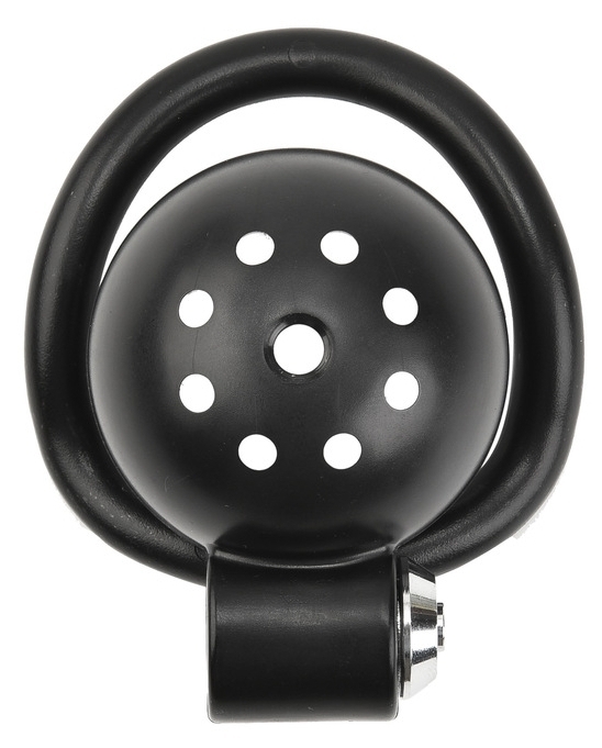 Cage avec une forme arrondie et courte de 4 cm de longueur.Diamètre intérieur de 3.5 cm.La surface est percée. Avec 5 anneaux de maintien (diamètre de 38 à 52 mm).Système de bouton et clé pour fermeture. En plastique ABS.