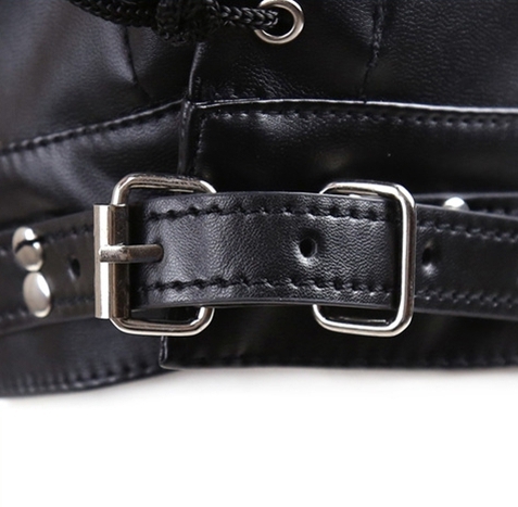 Cette cagoule est conçue afin d’isoler le partenaire sur le plan visuel et sensoriel.Elle se compose de rembourrage sur les oreilles pour isoler du son, un masque occultant la vue et un baillon pour empêcher l’usage de la bouche. Avec cordons à l’arrière pour la fixation. La cagoule est fabriquée en simili (polyuréthane).