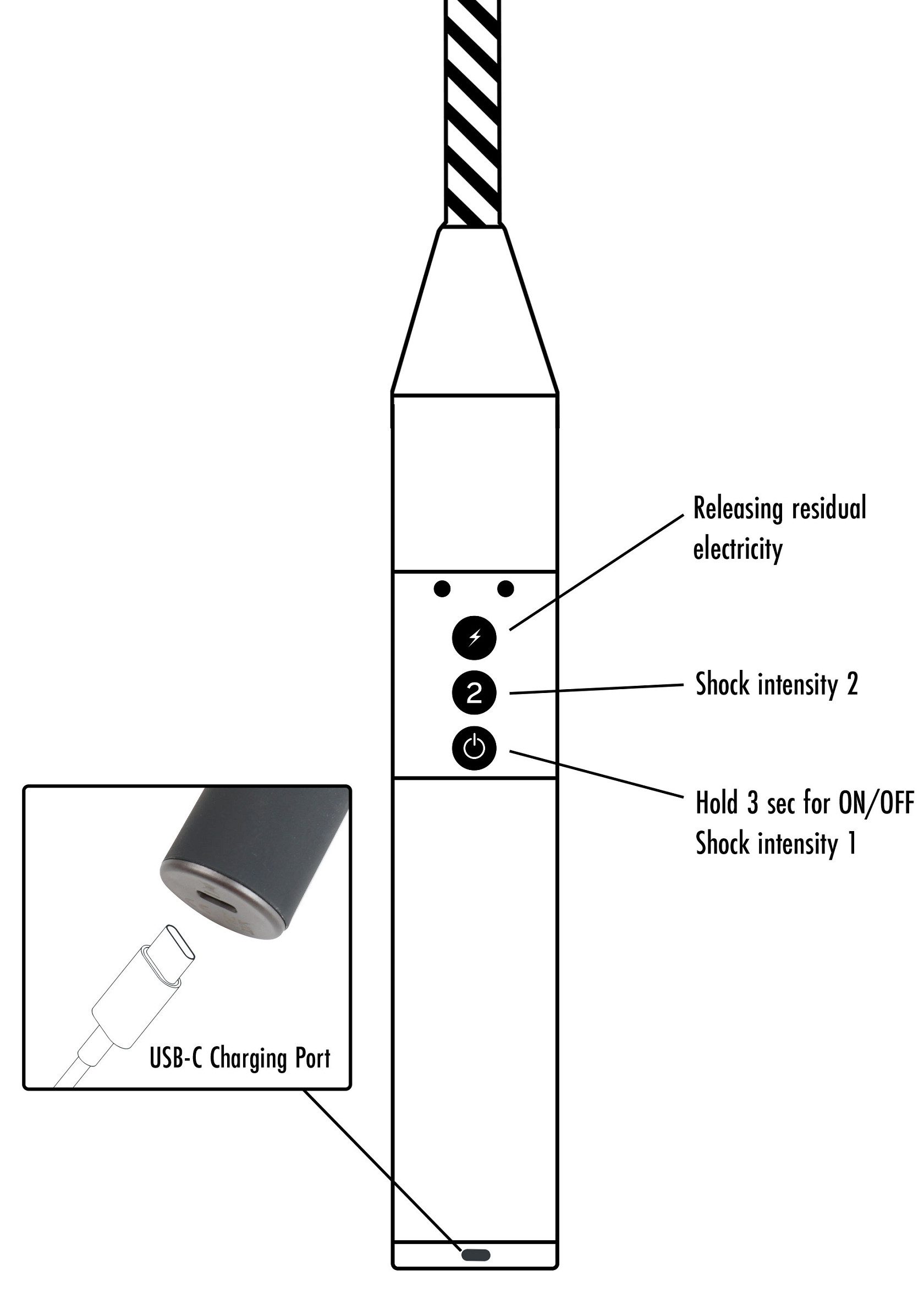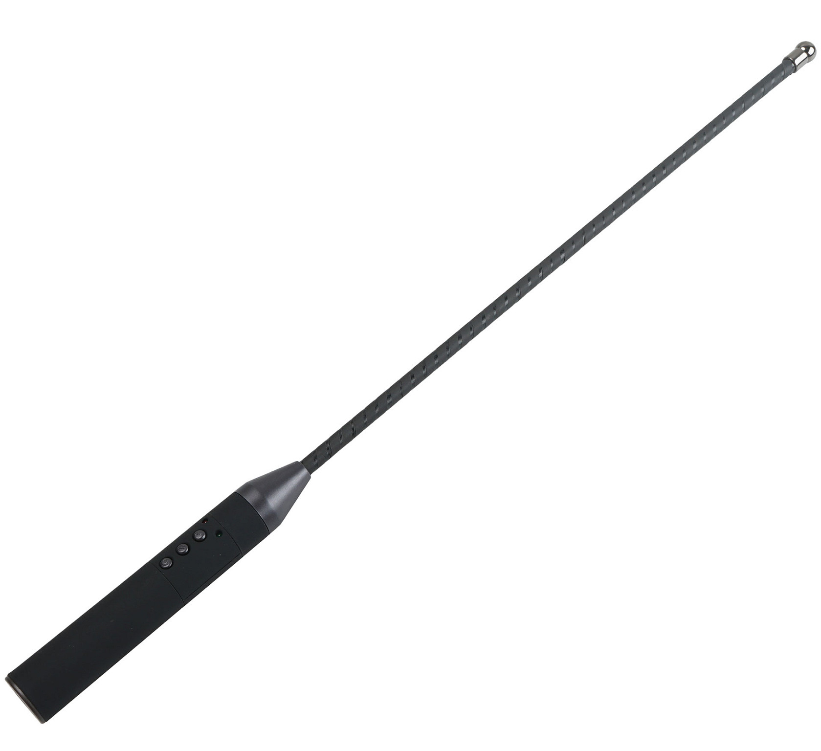 Canne de 55 cm de longueur totale avec une extrémité en métal (13 mm de diamètre).Elle envoie une impulsion électro intense sur la tige et permet de mener le partenaire.Tige avec revêtement simili.Recharge USB.