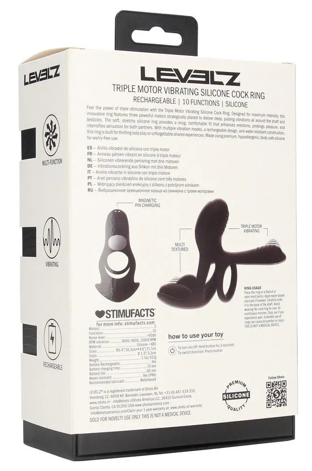 Caractéristiques :Longueur sur le pénis 9 cmLargeur maximale 3.6 cmDiamètres des anneaux 34mm et 38 mm10 modes de vibrationsBatterie Lithium – recharge USBNiveau sonore &lt 60dBAutonomie 65 minutesTemps de charge 70 minutesÉtanche à l’eau (IPX6 – pas d’immersion)Poids 108 grammes.Précautions :le nettoyer avant et après chaque utilisationl’utiliser uniquement avec du lubrifiant à base d’eaule conserver dans un endroit propre, sec et à l’abri de la chaleur, sans contact avec un autre objet.