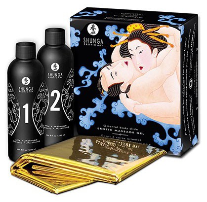 Fabriqué par la marque Shunga, ce coffret de massage permet de créer vous même votre gel de massage au dousx parfum de Fruits exotiques.S’appliquant directement sur le peau, il permet de réaliser de sensuels corps à corps pour des soirées coquines mémorables et excitantes. Le coffret oriental comprend: 2 flacons prêts à l’emploi 1 couverture étanche(160 x 228 cm) 1 notice détaillée