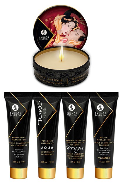 Le coffret Shunga que nous vous présentons contient tout le nécessaire pour enflammer vos soirées coquines.Il comprend: 1 Bougie de massage Romance (30ml) 1 Huile de massage Chauffante parfum Vin pétillant à la Fraise (10ml) 1 Lubrifiant à eau Toko (10 ml) 1 Huile de massage érotique parfum Vin pétillant à la Fraise (10ml) 1 Crème à sensations de chaleur glacée pour couple Dragon (10ml)