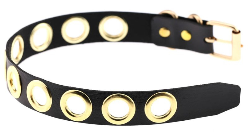Collier noir avec les boucles dorées.Largeur de 2.5 cm.Tour de cou de 15 à 35 cm. En simili et métal.