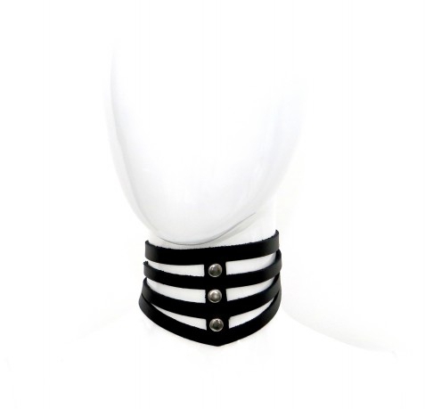 Ce collier en cuir est un accessoire de la marque The Red permettant de donner un look SM.Il se compose d’une forme en pointe avec des bandes de cuir et des rivets en métal. Le tour de cou va de 28 à 40cm. Fabriqué en cuir véritable de vache