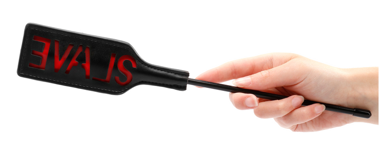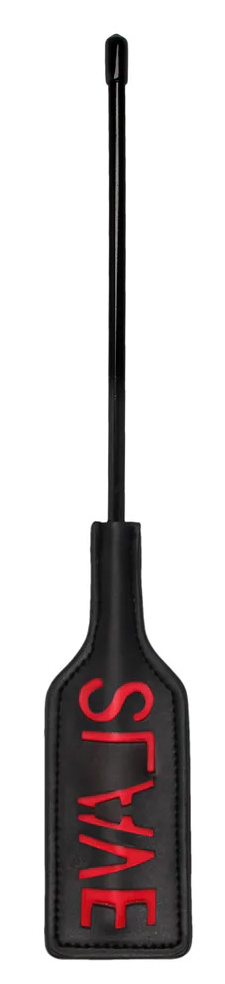 Cravache noire avec mot SLAVE qui viendra orner temporairement la peau de votre partenaire. Longueur totale de 31.5 cm. Largeur de 5 cm. En simili noir