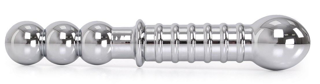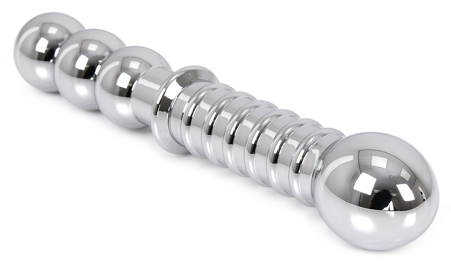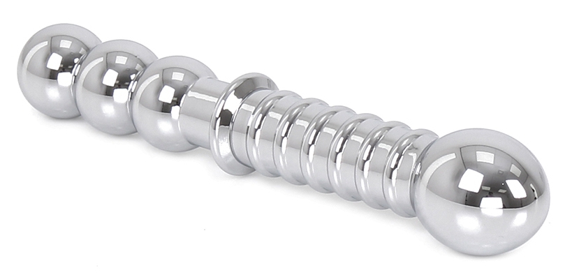 Ce double gode en métal est un sextoy idéal pour varier les sensations.En effet, il est composé de : une partie de 10cm de longueur insérable avec une surface nervurée. Boule de départ de 3.5cm de largeur puis 2.5cm de largeur l’autre partie de 8cm de longueur insérable avec 3 boules de 2.8cm de largeur. Longueur totale de 19cm