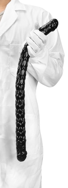 Gode de 52 cm de longueur conçu avec des extrémités en forme de gland.La surface est texturée comme des écailles. La largeur est de 3.5 cm sur les extrémités et de 3.3 cm ensuite. En PVC