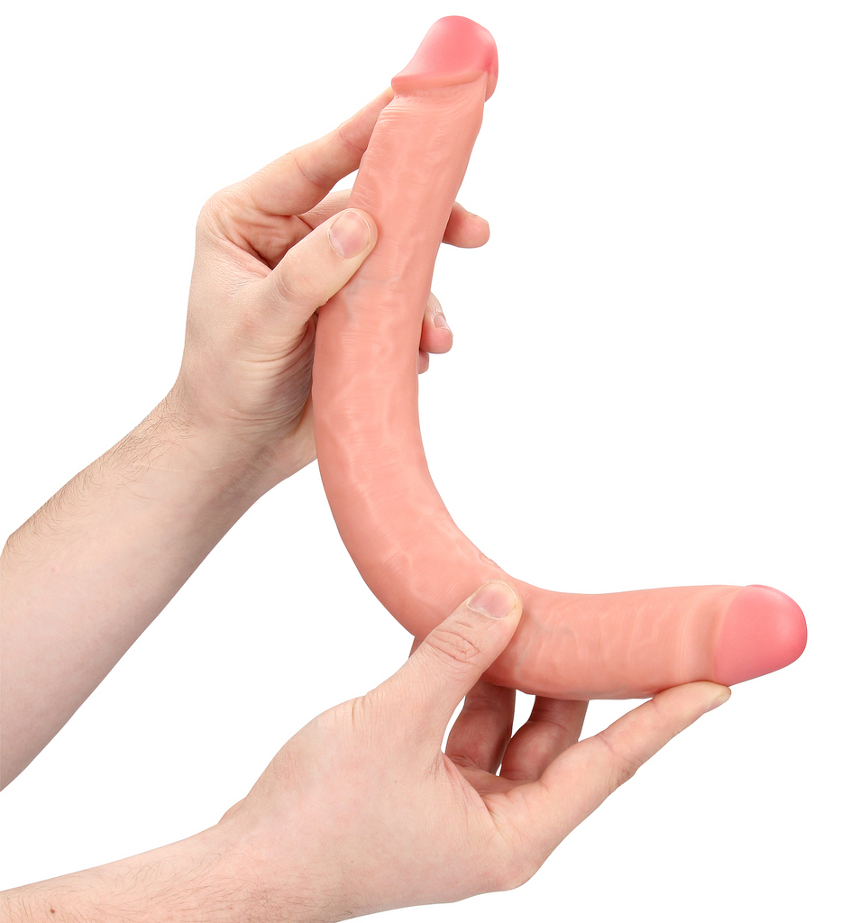 Double Gode souple pour une double pénétration Glands décalottés et surface veinée Longueur insérable totale 35.5 cm et largeur maximale 3.8 cm Double gode en PVC