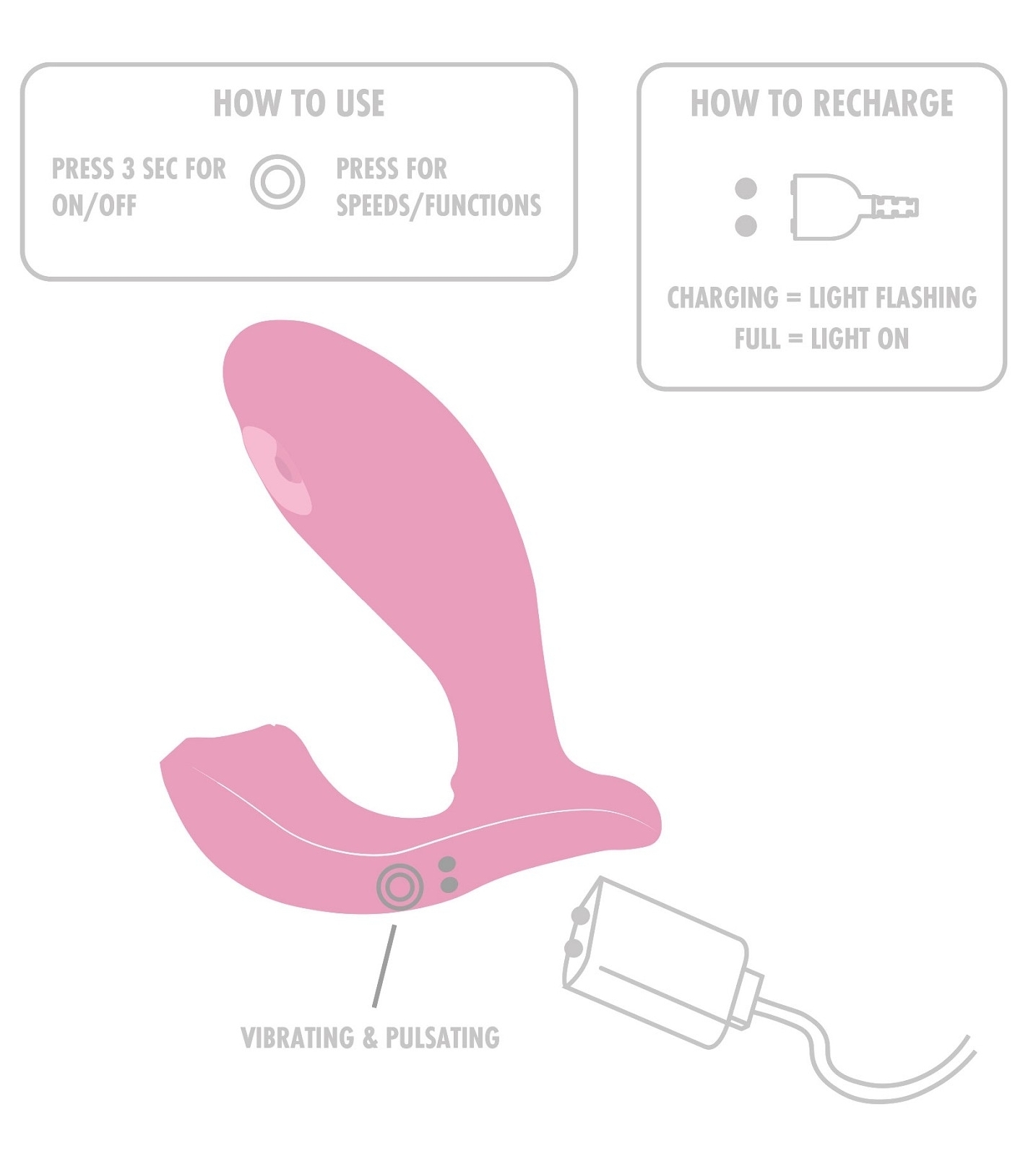 Caractéristiques :  Longueur totale 11 cm Longueur insérable 9 cm  Largeur 2 à 3.2 cm 7 rythmes de vibrations 3 vitesses Rechargeable — batterie lithium Étanche, ne pas immerger En silicone Conseils d’utilisation :  le nettoyer avant et après  l’utiliser, uniquement, avec du lubrifiant à base d’eau le conserver dans un endroit sec et propre, à l’abri de la lumière et de la chaleur, sans contact avec d’autres objets.
