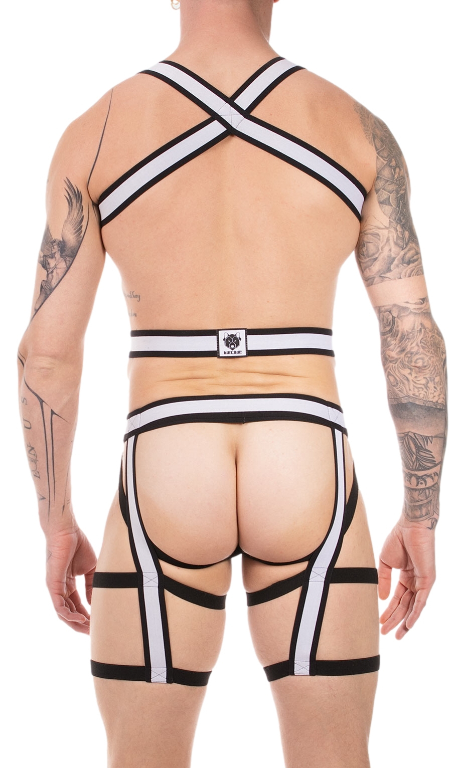 Ensemble avec des bandes élastiques de 4 cm de largeur passant sur le buste et les cuisses.Style sexy. Jockstrap non inclus. Composition : 45% Polyamide, 35% Polyester, 20% Élasthanne
