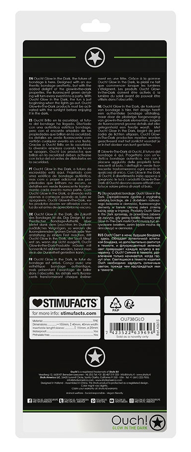 La phosphorescence s’active après une exposition prolongée à la lumière. Conseils d’utilisation : Nettoyer après chaque utilisation Utiliser un lubrifiant à base d’eau Conserver dans un endroit propre et sec Éviter le contact prolongé avec un autre objet