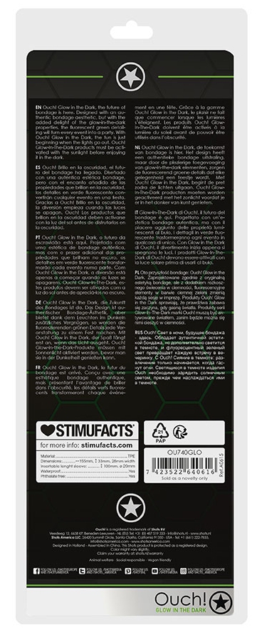 La phosphorescence s’active après une exposition prolongée à la lumière. Conseils d’utilisation : Nettoyer après chaque utilisation Utiliser un lubrifiant à base d’eau Conserver dans un endroit propre et sec Éviter le contact prolongé avec un autre objet