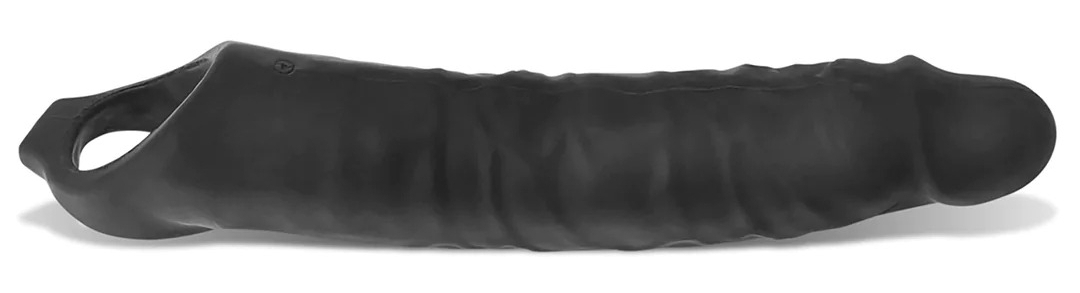 Gaine de pénis noire avec une longueur de pénétration de 21 cm et une largeur de 5.5 cm.Les dimensions intérieures sont de 16 x 3.5 cm. Avec 3 embouts supplémentaires pour diminuer la longueur intérieure. En matière silicone + TPR