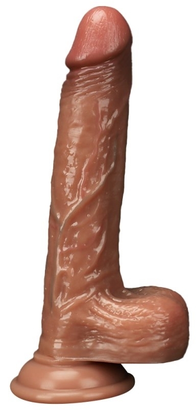 Gode muni d’une base ventouse Gland décalotté, surface veinée et bourses rondes.  Longueur insérable de 15 cm et largeur de 3 à 3.6 cm.  En silicone