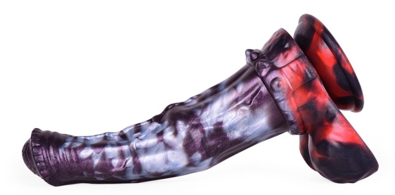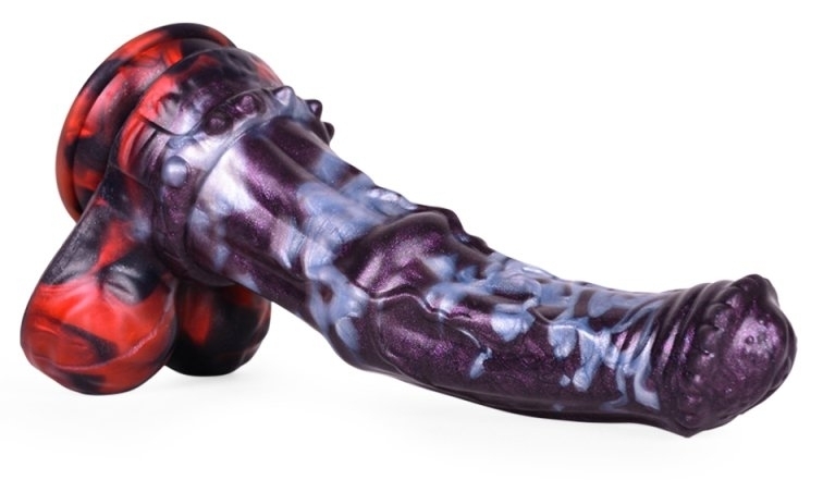 Forme originale et couleurs funs pour ce gode de 19 cm de longueur insérable.La largeur va de 4 à 5 cm. La surface est texturée.Avec une base ventouse surmontée de bourses. En silicone.