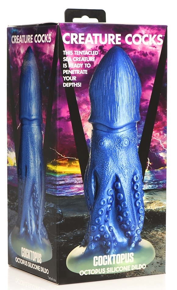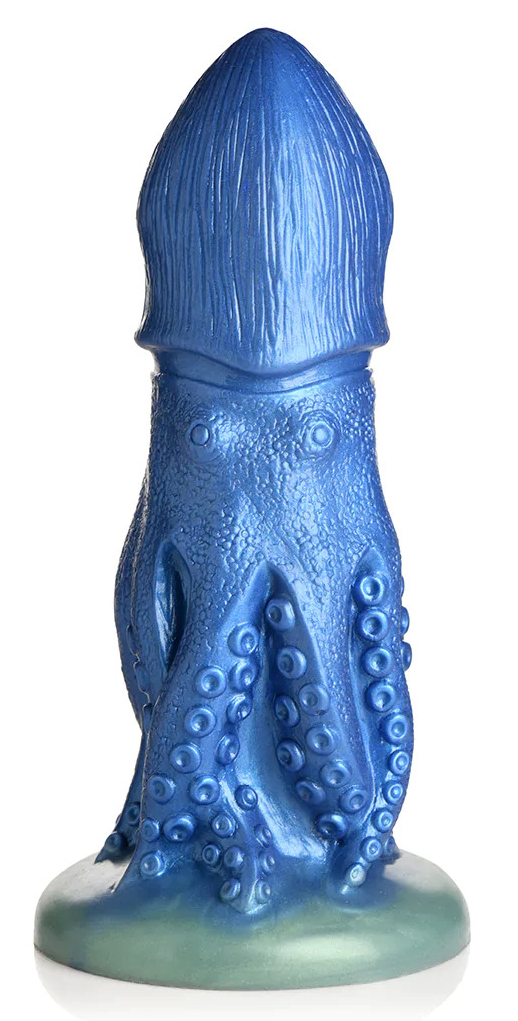 Gode monster avec une forme de pieuvre Plusieurs types de texture : lignes verticales, petits reliefs ressemblant à des écailles avec tentacules.  Bleu foncé Base ventouse Longueur de 19 cm. Largeur de 7 cm au maximum En silicone