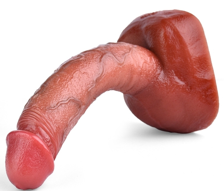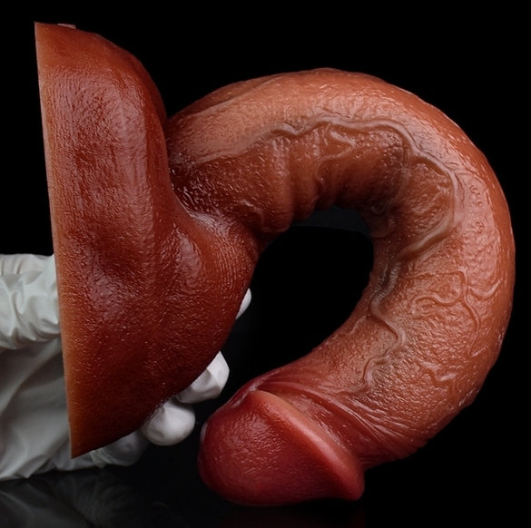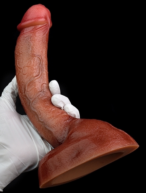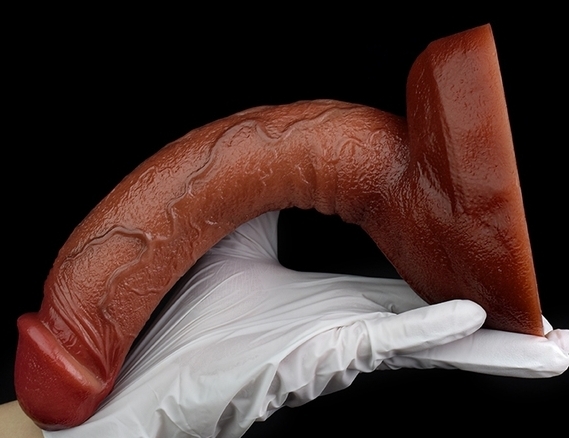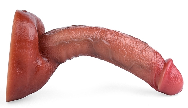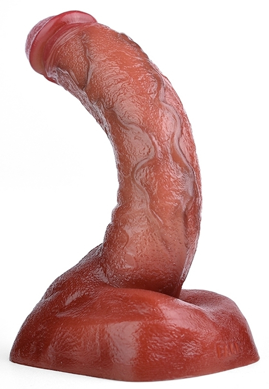 Gode à la surface texturée, muni d’une base ventouse. Longueur insérable de 20 cm et largeur de 4.5 cm. En silicone marron.