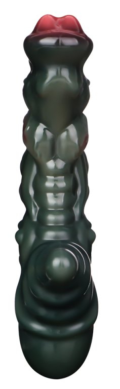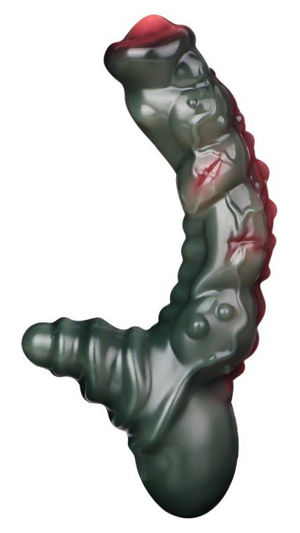 Gode avec une forme originale et une surface texturée.Avec une courbure et la longueur insérable de 17 cm.Largeur maximale de 4.5 cm.En silicone.