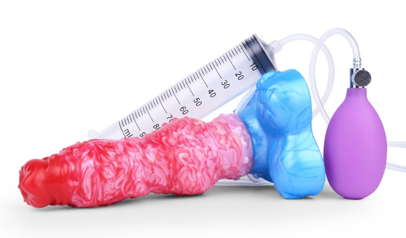 Gode avec une couleur rose marbrée et base bleue.Il est éjaculateur et gonflable.Longueur insérable de 17 cm. Largeur maximale de 9 cm après le gonflage.Avec une base ventouse.En silicone.