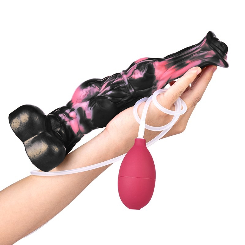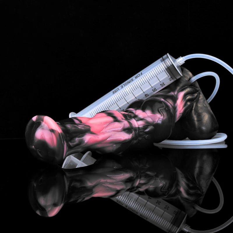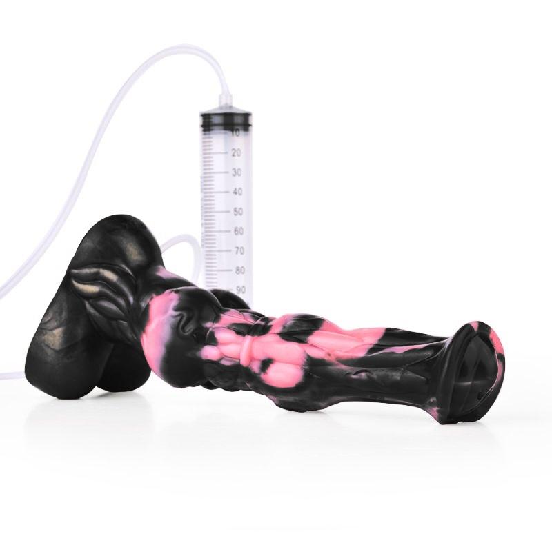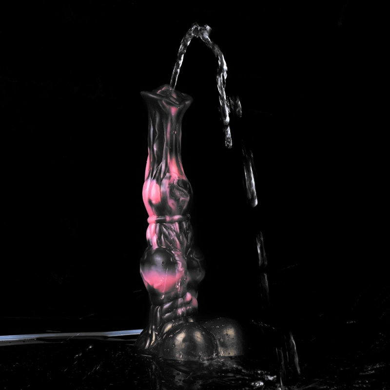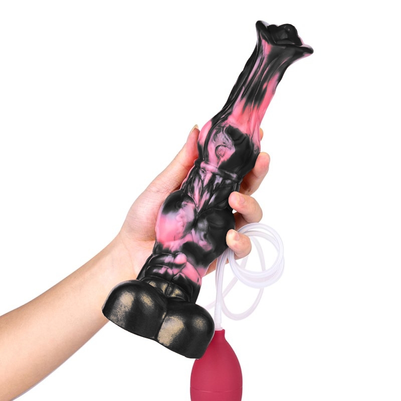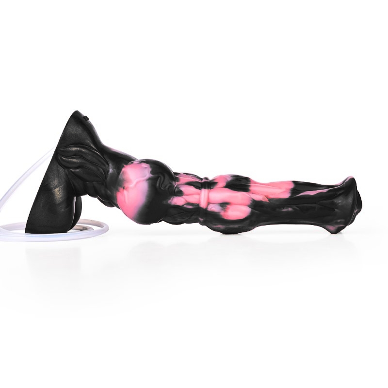 Gode éjaculateur noir et rose avec une forme de sexe de cheval. Longueur insérable de 22 cm. Largeur de 5 à 6 cm. Avec une base ventouse. En silicone