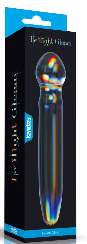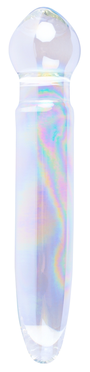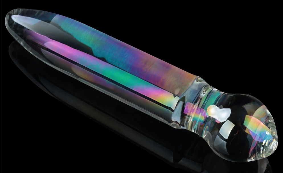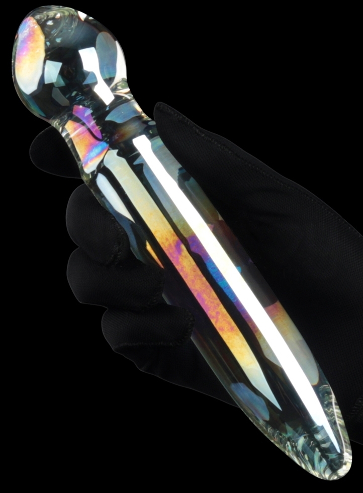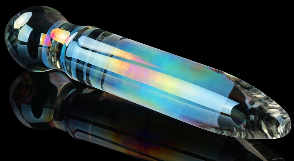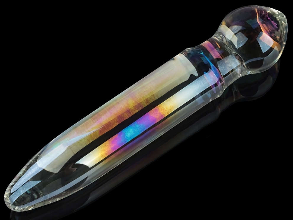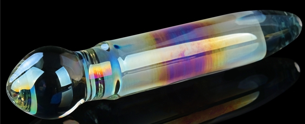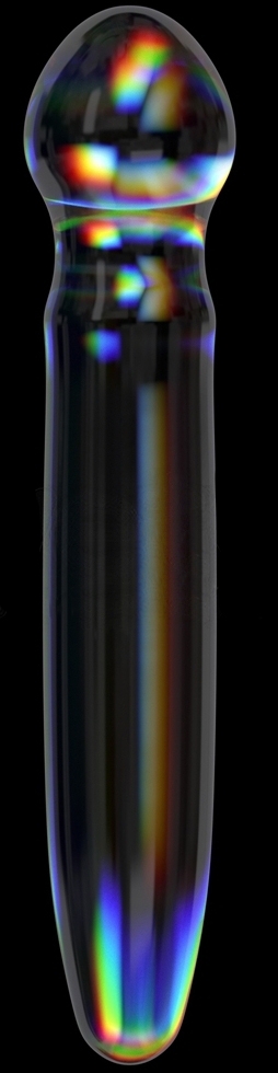 Gode en verre avec reflet de diverses couleurs. Forme de goutte à une extrémité d’un diamètre de 3.7 cm. Tige droite de l’autre côté de 3 cm finissant en pointe. Dimensions : Longueur totale de 18 cm. Largeur de 3 à 3.7 cm. En verre borosilicate.