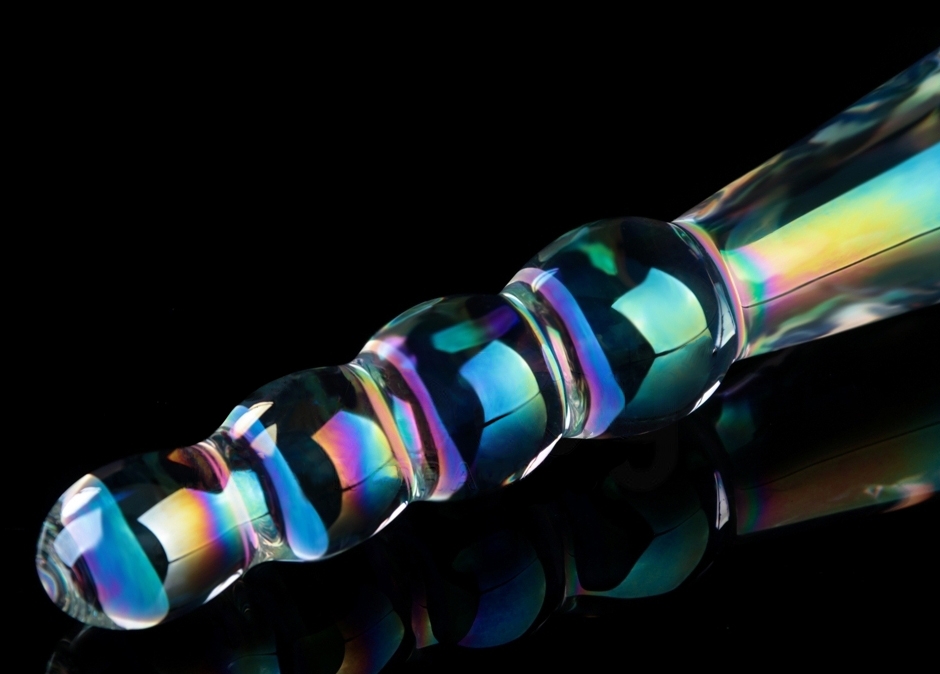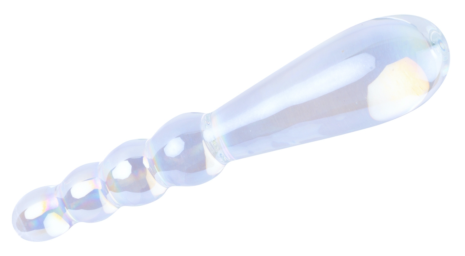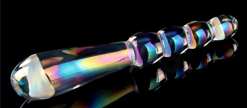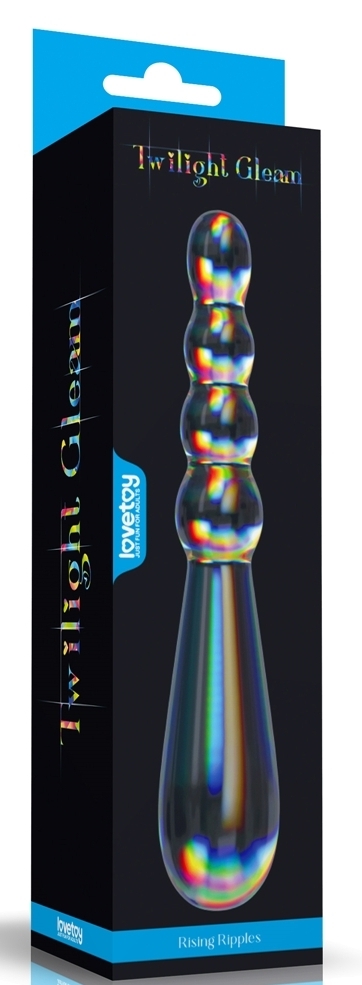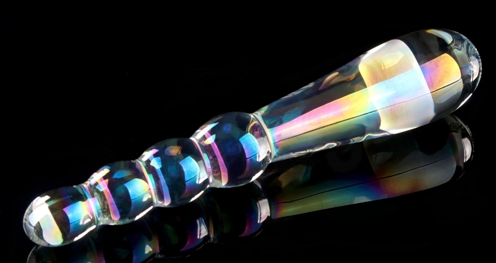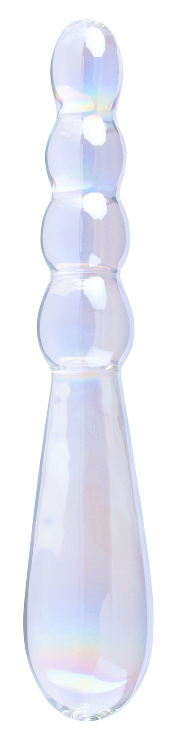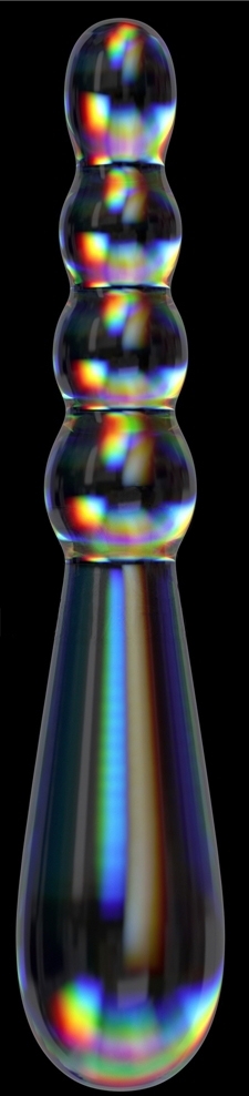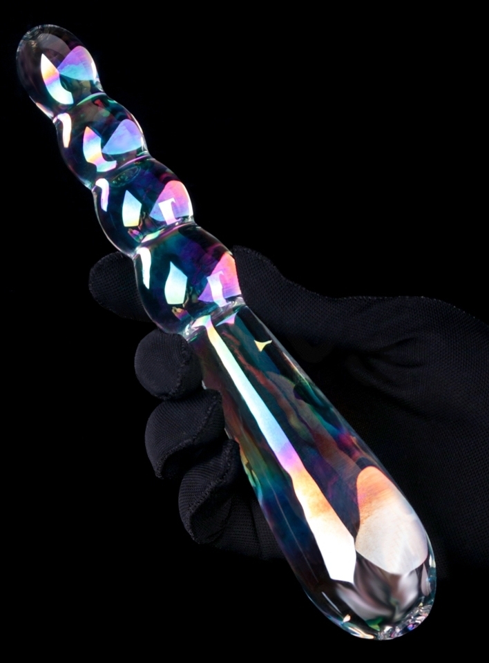 Gode en verre transparent à double entrée. D’un côté, boules progressives de 1.8 à 2.5 cm de diamètre. De l’autre, forme ovale longue de 3.5 cm de large. Dimensions : Longueur totale de 18 cm. Largeur de 2.6 à 3.5 cm