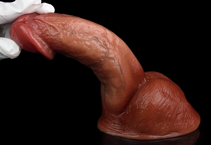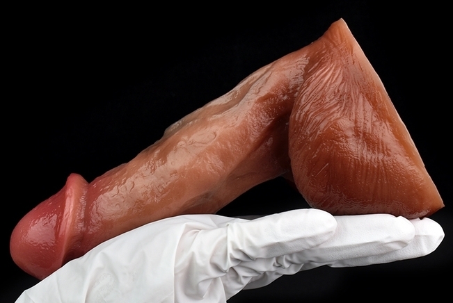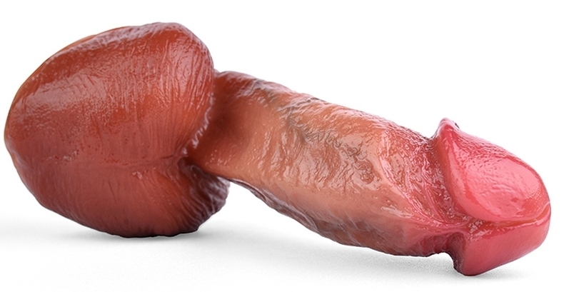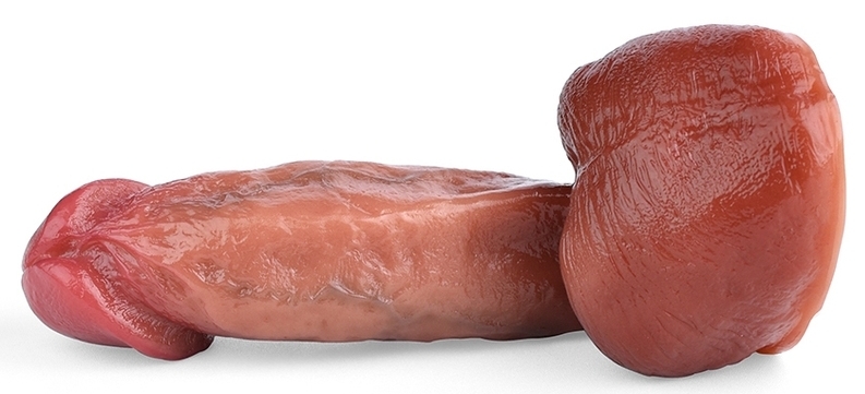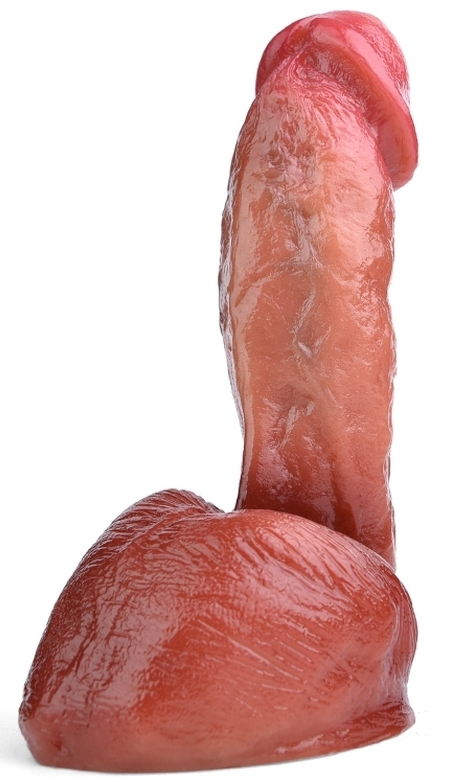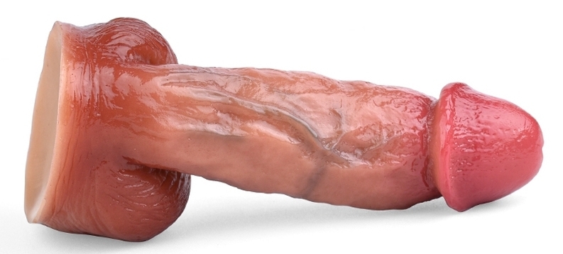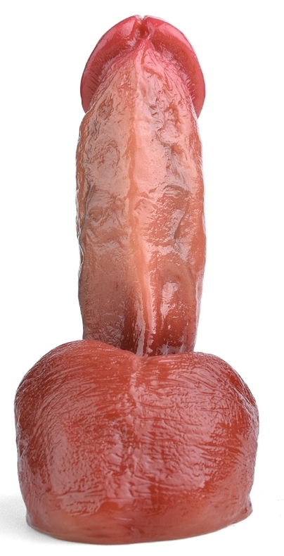 Gode avec de grosses bourses, gland décalotté et surface veinée. Longueur insérable de 13 cm et largeur de 4 à 4.5 cm. En silicone