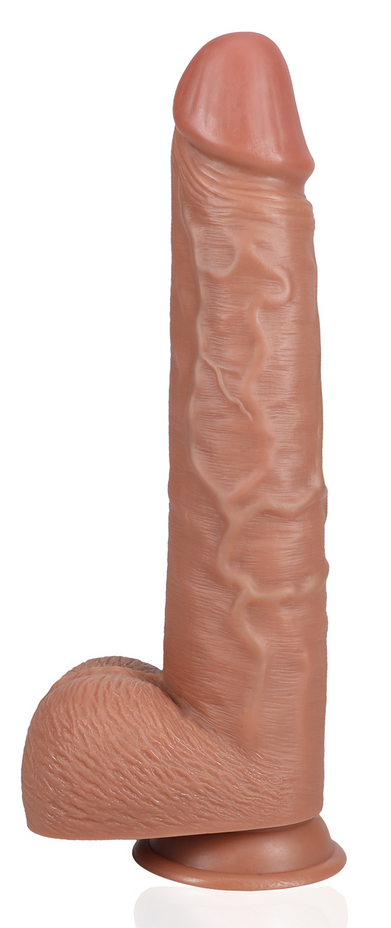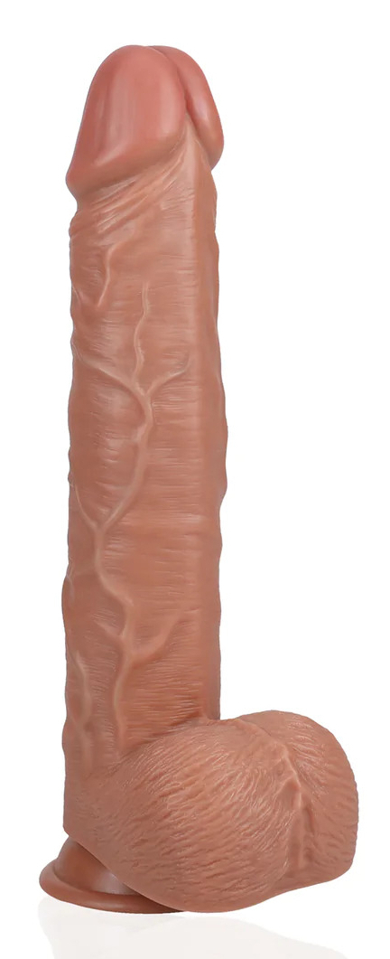 Gode avec gland décalotté et surface veinée Base ventouse Longueur insérable de 26.5 cm et largeur maximale de 6.5 cm. Poids de 1.550 kg En PVC