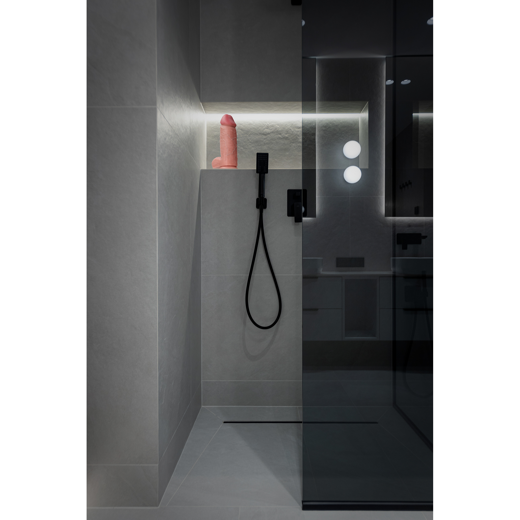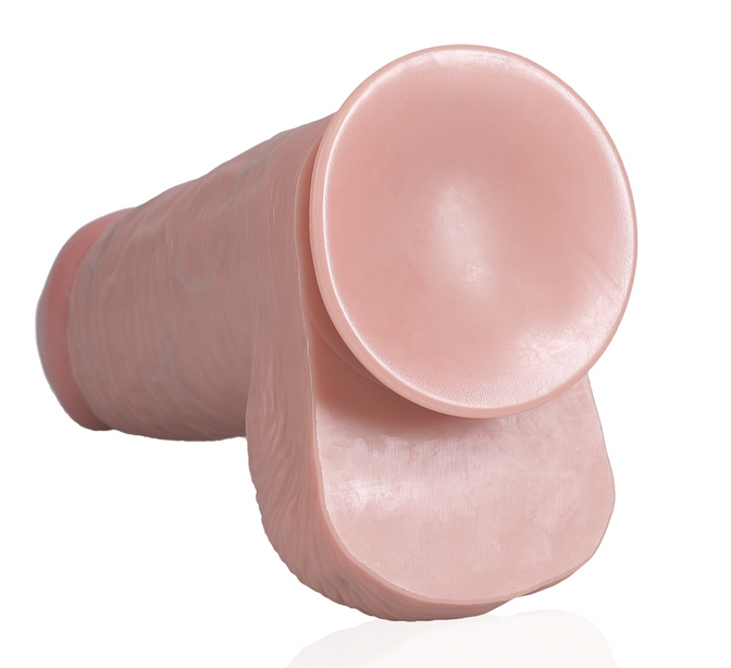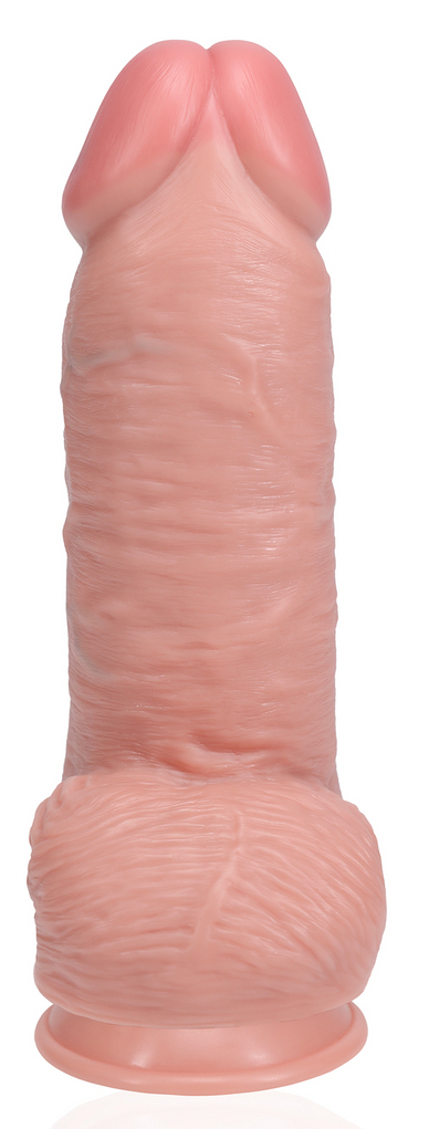 Gode à la surface texturée Veines apparentes en relief Gland décalotté et bourses Muni d’une base ventouse Étanche Longueur insérable de 16 cm et largeur maximale de 6 cm. Gode en PVC