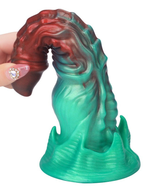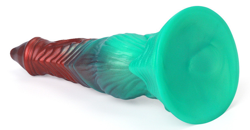 Gode à la forme atypique, avec gland en pointe et surface texturéeLongueur insérable de 17 cm et largeur de 3.5 à 5.5 cm.En silicone, avec base ventouse