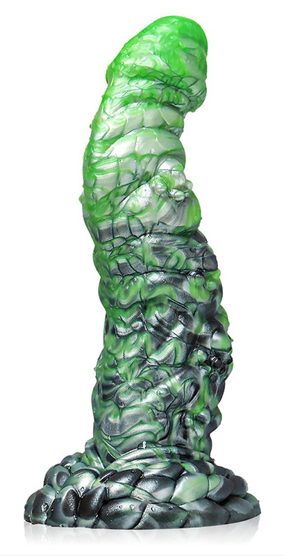 Forme insolite et surface texturée avec une longueur insérable de 19 cm.Largeur de 2 à 5.7 cm.Avec une courbure et une base ventouse.En silicone couleur vert-noir.
