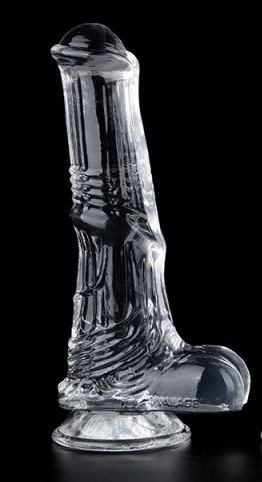 Gode avec une forme de sexe de cheval, d’une longueur insérable de 15 cm. Sa largeur va de 3.5 à 4.2 cm, avec une surface texturée. Il est muni d’une base ventouse. En TPE transparent.
