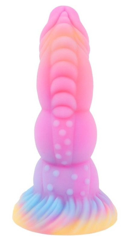 Gode avec une forme rappelant un dos de dragon avec des crêtes de différentes tailles, un gland décalotté et des picots ronds sur le bas du sextoy. Longueur insérable de 18 cm. Largeur de 3 à 6 cm.Base ventouse. En silicone.