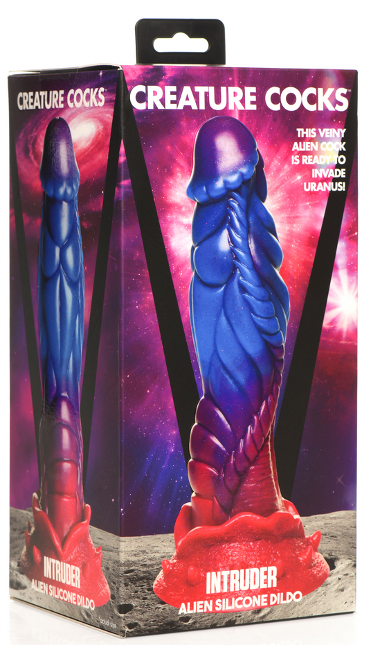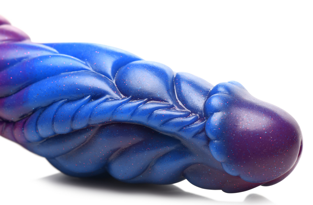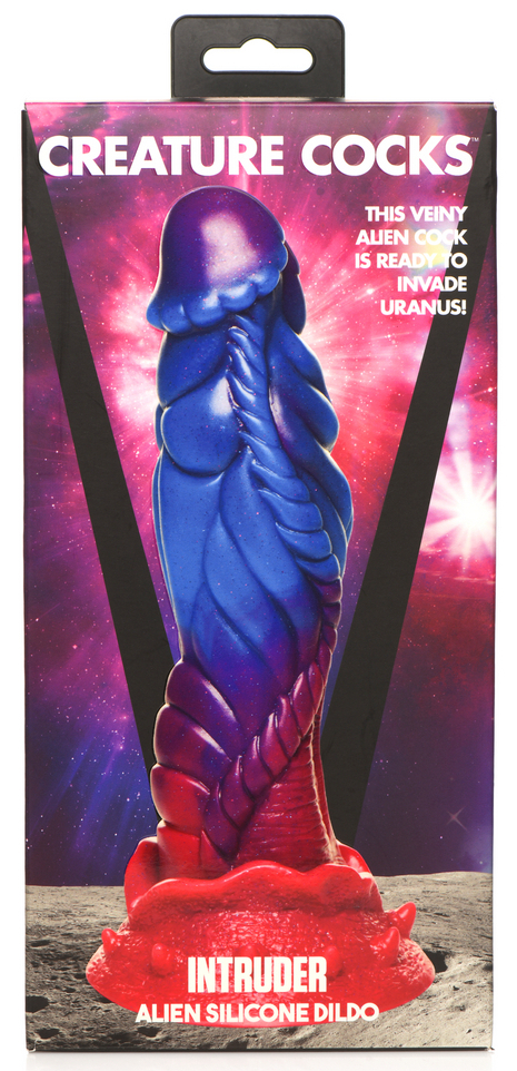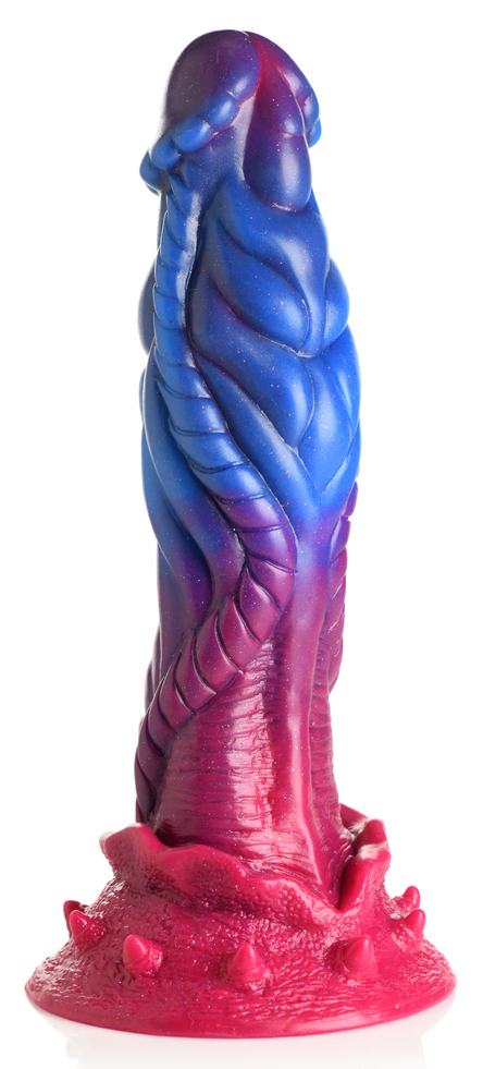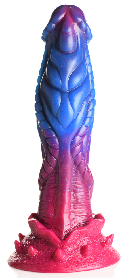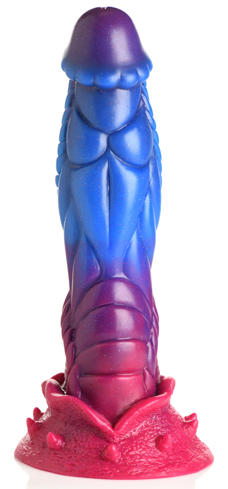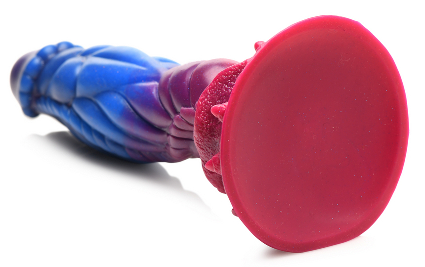 Gode monster représentant un sexe d’alien Différentes textures dans un mélange de bleu et de rouge Base ventouse puissante Longueur insérable de 18 cm pour une largeur de 5.5 cm En silicone