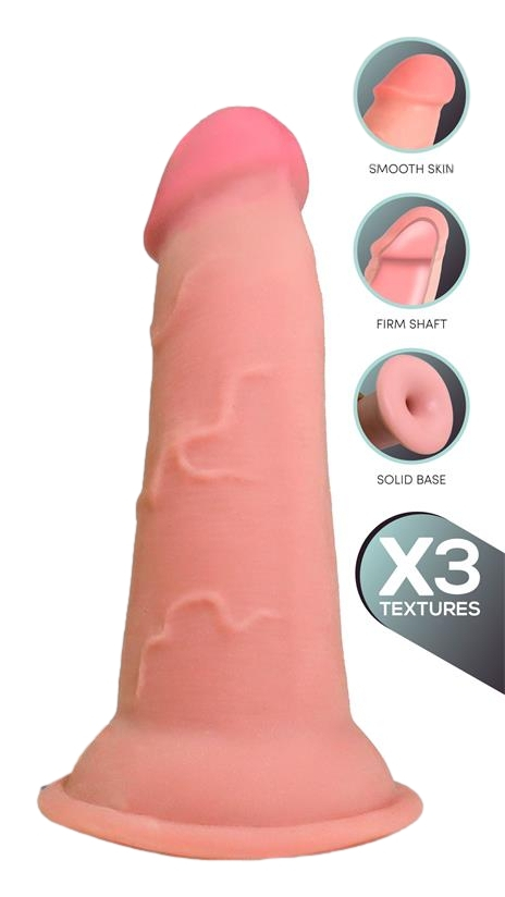 Gode avec une longueur insérable de 13 cm et une largeur allant de 3 à 4.5 cm.Sa structure est en Triple densité pour encore plus de réalisme. Gland décalotté et surface veinée.Base compatible avec les harnais de gode ceinture. En TPE.