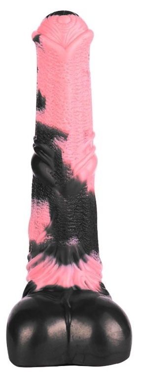 Gode en forme de sexe de cheval et une couleur noire et rose. La longueur insérable est de 20 cm. La largeur va de 4.5 à 5.5 cm. Avec une base ventouse. En silicone