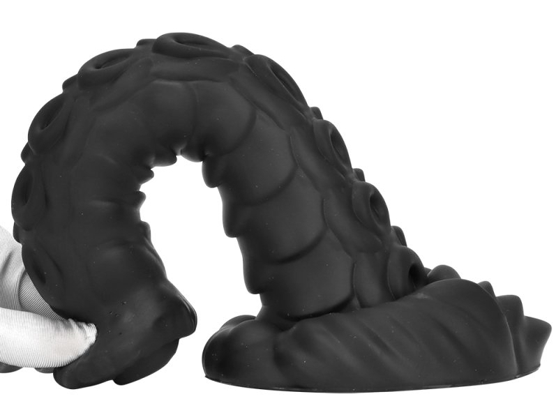 Gode à la forme incurvée et au relief texturé.Longueur insérable de 22 cm et largeur de 4.3 à 5.8 cm.En silicone, avec base ventouse.