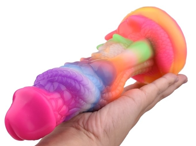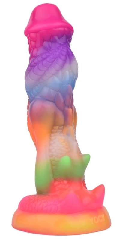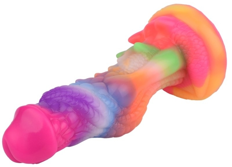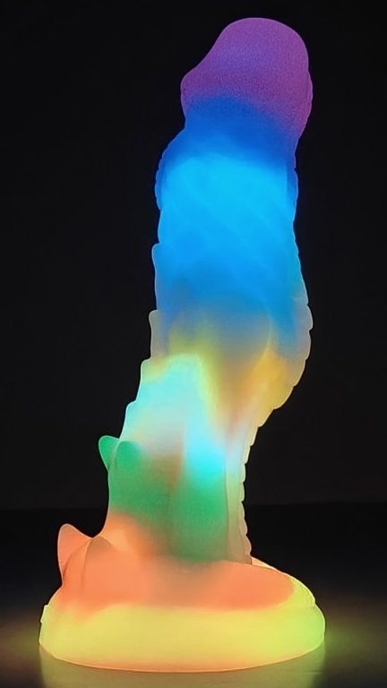 Gode couleur à la forme atypique et au relief texturé avec un gland décalotté. Il est phosphorescent après exposition au soleil. Longueur insérable de 18 cm et largeur de 3.5 à 4.8 cm. Gode en silicone doux muni d’une base ventouse