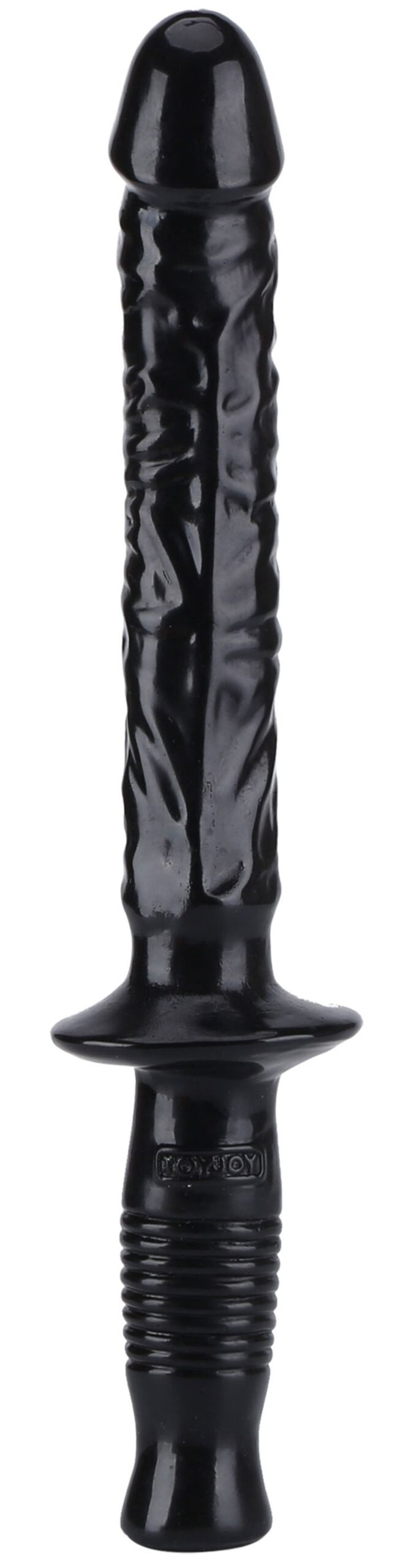Gode noir avec une poignée. Forme réaliste et surface veinée.Longueur insérable de 23 cm. Largeur de 4 cm. Longueur totale de 38 cm. En PVC