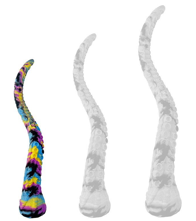 Gode avec une longueur insérable de 40 cm et une largeur de 1.2 à 4.3 cm. Avec une surface conçue comme sur un tentacule.Couleurs funs.En silicone.