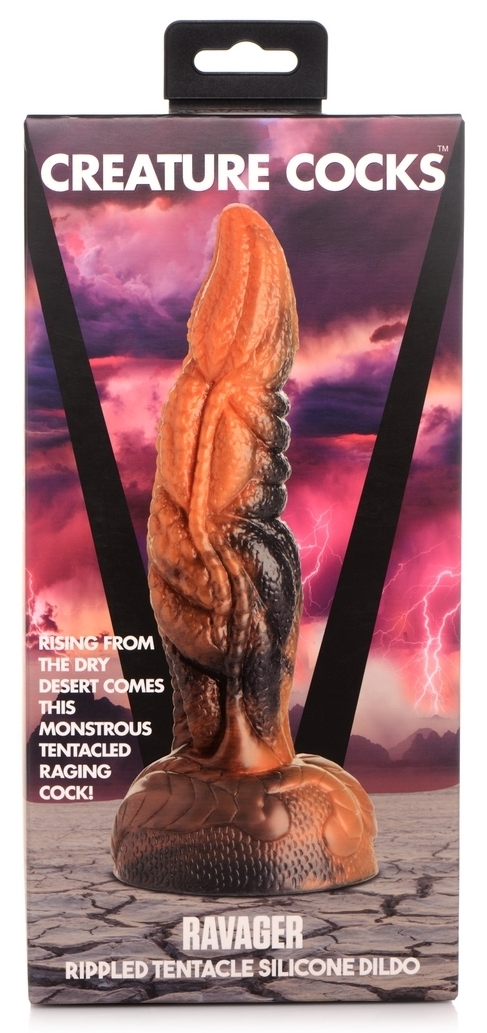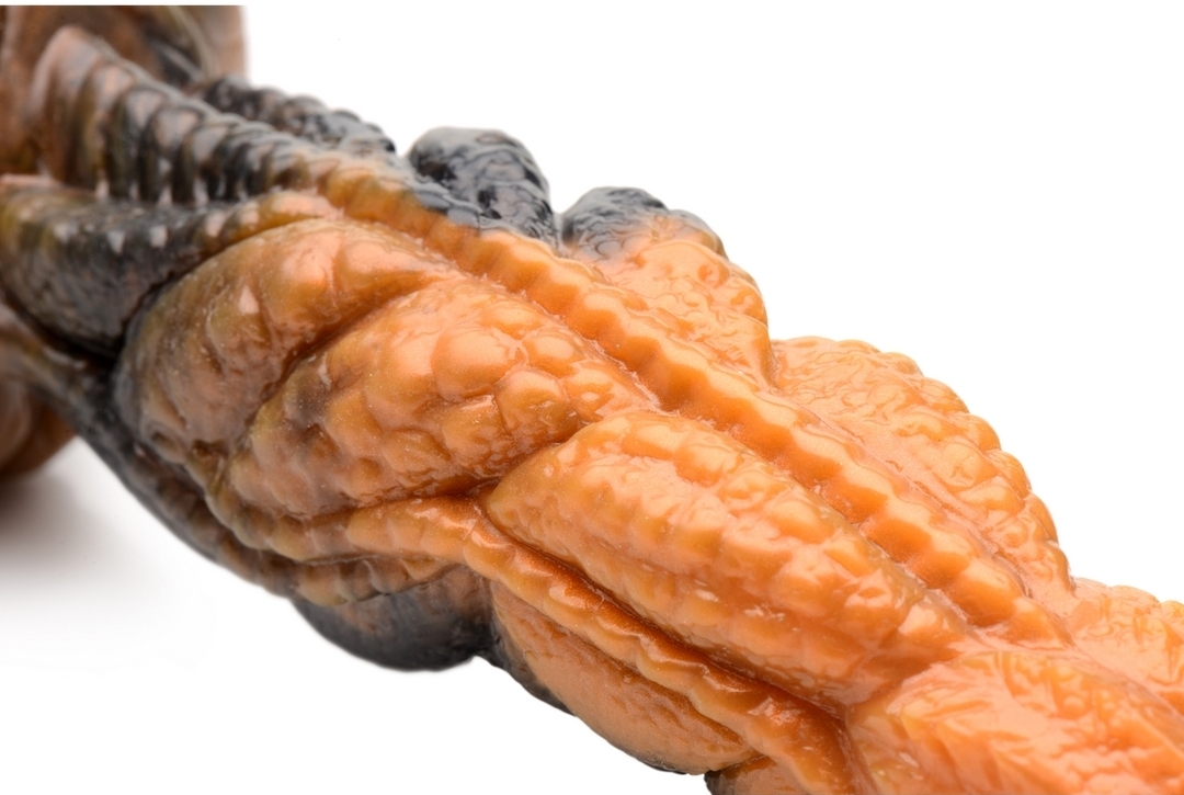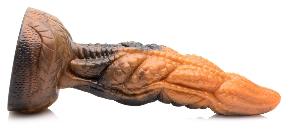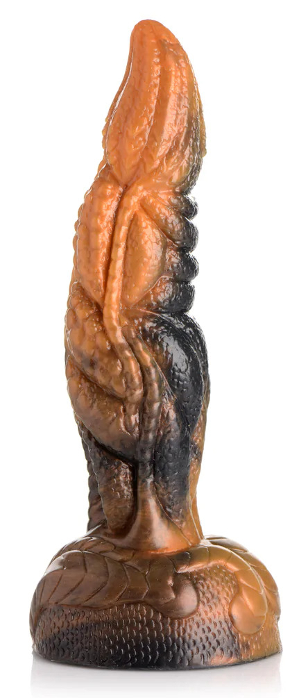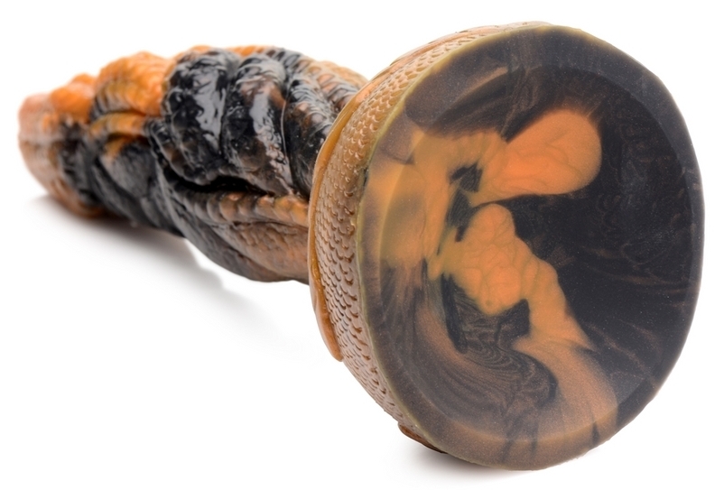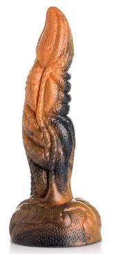 Gode monster ressemblant à un tentacule reptilien Texture picots Cuivré et marron noir. Base ventouse Longueur insérable de 17 cm. Largeur de 2 à 4.5 cm. En silicone
