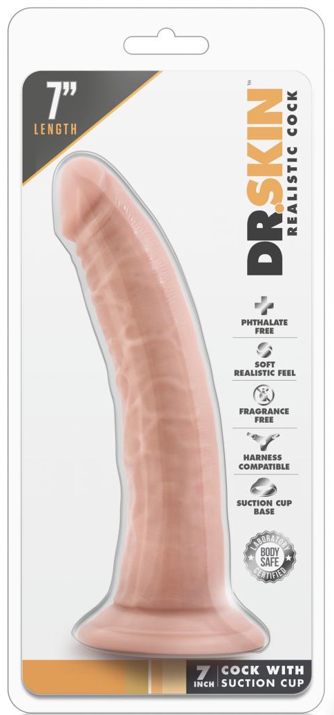 Ce gode réaliste Dr Skin est un accessoire de plaisir conçu avec une forme courbée et une largeur progressive.La largeur atteint alors 4cm. La longueur insérable est de 17cm.Avec une surface légèrement veinée. La ventouse permet un jeu plus facile. En PVC